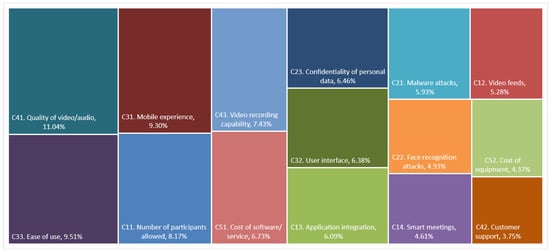 As the results from the G-AHP calculation, the grey weights and their transformed crisps are shown in Table 8. For example, for the grey weight of criteria C11, the number of participants allowed has the lowest weight (lower bound) at 0.060 and the highest weight (upper bound) at 0.104. Similar to this procedure, for the grey weight of criteria C12, video feeds has the lowest weight at 0.038 and the highest weight of 0.068. The significance levels of 15 criteria of the G-AHP model are displayed in Figure 4. The results indicate that the five most significant criteria are C41, quality of video/audio; C33, ease of use; C31, mobile experience; C11, number of participants allowed; and C43, video recording capability, with significance levels of 11.04%, 9.51%, 9.30%, 8.17%, and 7.43%, respectively. Meanwhile, C42, customer support, is specified as the least significant criterion, with a value of 3.75% compared to other considered criteria. The findings suggest that decision makers focus on “C41”, “C33”, “C31”, “C1”, and “C43” for improving the performance of the video conferencing software.
