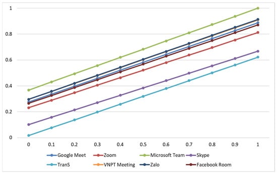 A sensitivity analysis was performed to establish the robustness and stability of the proposed MCDM model []. The sensitivity analysis of the preference coefficient (i.e., the threshold value of the EDAS model, ) was conducted to validate the ranking order []. In a previous relevant study, the value of was considered to be 0.5 () for base case analysis. However, this setting does not reflect the actual scenario in which various decision-makers have different preferences. Hence, in this paper, the preference coefficient of the EDAS model fluctuates in the range of , as shown in Table 10. The change result is visualized in Figure 6. The ranking result shows that the optimal video conferencing software companies are always the same when changing the values of coefficient preference () from 0 to 1. It can be concluded that Microsoft Teams (VCS-03) is consistently the optimal video conferencing software company to use. Following that, Zalo (VCS-07) and VNPT Meeting (VCS-06) are also ranked second and third positions, which are also more suitable alternatives among other candidates. The applicability and robustness of the proposed MCDM model are demonstrated. Decision-maker psychology should be considered when making decisions in determining the optimal video conferencing software companies from multiple choice.