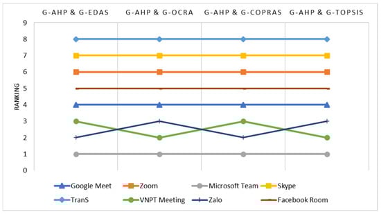 To analyze the practicality of the new integrated approach of G-AHP and G-EDAS methods introduced in this paper, the above-mentioned issue of choosing the best-suited VCS for businesses is considered. The alternatives are Google Meet (VCS-01), Zoom (VCS-02), Microsoft Teams (VCS-03), Skype (VCS-04), TranS (VCS-05), VNPT Meeting (VCS-06), Zalo (VCS-07), and Facebook Room (VCS-08), as can be seen in Table 3. A summary of these alternatives is presented as follows. Google Meet is a web-based videoconferencing tool provided by the Google company (Ho Chi Minh City, Vietnam). Zoom is a software platform that allows for face-to-face meetings and delivers video, audio, and message services for global distance communication. Microsoft Teams is a video conferencing and talking platform. Skype online meeting software is released by Microsoft. The main users are organizations and units that conduct online video conferencing meetings. This software works with various smart devices and can scale up to 250 people. VNPT Meeting is a product of Vietnam Posts and Telecommunications Group (VNPT) in cooperation with Polycom. This is a cloud-based video meeting solution. VNPT Meeting makes it easy for organizations to conduct online meetings anywhere and on any PC, laptop, or mobile device such as smartphones and tablets with an internet connection. The service allows multiple people to attend online meetings at different locations simultaneously. TranS is released by Namviet Telecom Company (Ho Chi Minh City, Vietnam). This online learning and meeting application allows video chats anytime, anywhere. TranS is a useful tool that is widely used in education and helps businesses connect online quickly. Zalo is an application that allows free texting and calling on mobile and computer platforms used by many users. Zalo is researched, developed, and published by VinaGame Company (VNG), Vietnam. To meet the needs of online meetings during the pandemic, Zalo has launched a new feature that allows online sessions for groups of many people simultaneously. Online VCS via Facebook Room is implemented based on the application platform released by Facebook, allowing up to 50 people to join a meeting simultaneously on many different types of devices.