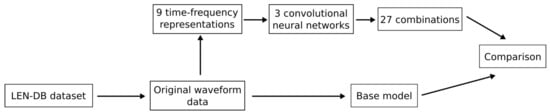 The concept of our experiment was to train three state-of-the-art CNNs using different TFRs, and compare their performance on earthquake detection with the base model. The base model was trained on the original waveform data. The experiment was divided into two parts: data preprocessing and neural network training. Data preprocessing included random sampling of the Local Earthquakes and Noise DataBase (LEN-DB) [11] (further described in Section 2.2) and TFRs extraction (further described in Section 2.3). Both the base model and the CNNs are detailed in Section 2.4. The main phases of the experiment are depicted in Figure 1.