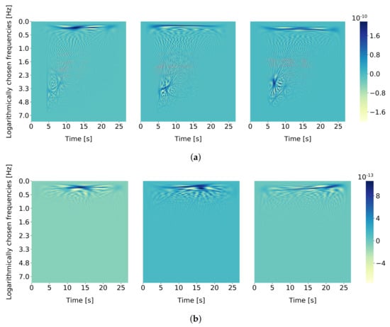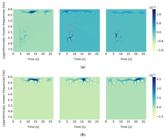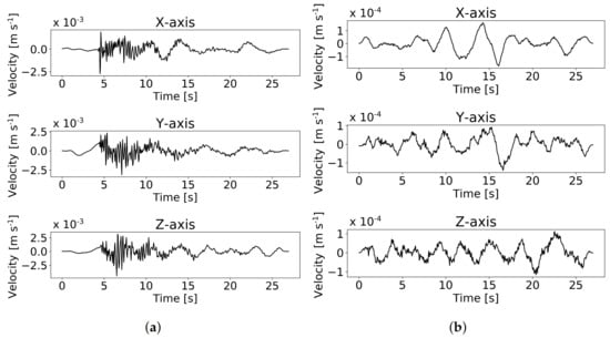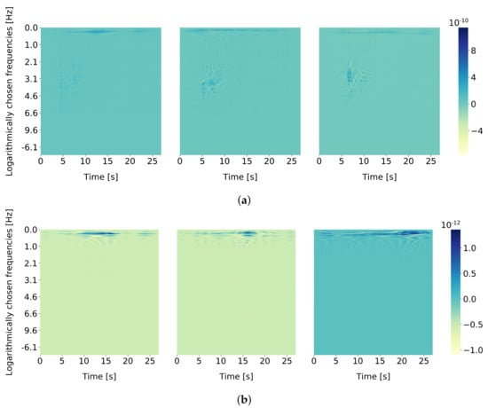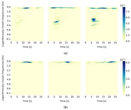 Pseudo Wigner–Ville transformations of (a) an earthquake and (b) noise shown in Figure 2. All three axes are presented.