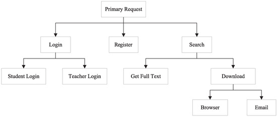 Among them, represents a main privacy request attribute (main attribute), represents a source attribute, and represents a behavior attribute. In Figure 1, requests for login and registration can be expressed as behavior request attributes, and download requests for resources can be regarded as resource request attributes. We construct the user’s access attributes into a privacy attribute tree (PA-T), which is composed of a limited number of nodes. Among them, the privacy request attribute is the root node, and we define the child nodes of as , , , …. According to these child nodes, we can decompose a privacy attribute tree into different subtrees, each of which has () as the root node. In the example in Figure 1, the primary request is the root node of the tree, which contains three child nodes. In addition, the child node login also includes student login and teacher login. Similarly, other subtrees also contain one or more child nodes.