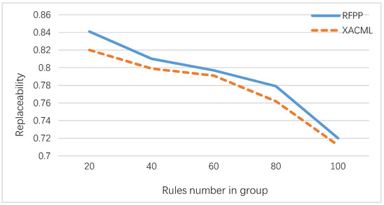 In the experiment, we randomly selected 20, 40, 60, 80 and 100 rules from 100 regularized privacy protection policies to form 5 groups. After fusing the privacy protection rules in the group, a new unified description privacy rule is obtained. We compare the fusion rules of each group with all the rules in the group and obtain several alternative results. We use the average of all the substitutability results as the final fusion rule substitutability of the group. In order to verify the superiority of the method proposed in this chapter, the XACML general strategy fusion method is compared. The comparison results of the fusion substitutability of each group are shown in Figure 2.
