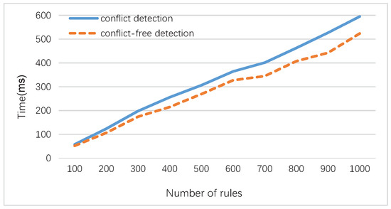 In this section, two experiments are designed to verify the conflict detection. In the first experiment, we compared the time consumption of fusion according to the number of heterogeneous rules in the proposed scheme from 100 to 1000, with an interval of 100, as shown in Figure 3, where the time unit is milliseconds. It is not difficult to find that with an increasing number of heterogeneous rules, the consumption of privacy protection rule fusion time also increases. The rule number and time consumption almost maintain a linear relationship, and the increase of time consumption is acceptable compared with the method of conflict-free detection. At the same time, the proposed fusion algorithm can avoid conflict among the rules and has good practical value.