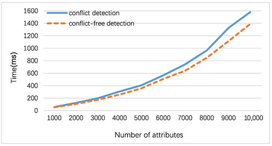 In order to further study the characteristics of the time complexity of the proposed scheme, the experiments in this section not only analyze the influence of the number of heterogeneous rules on the fusion time, but also consider the influence of the number of attributes in the heterogeneous rules on the fusion time. As shown in Figure 4, the time consumption of fusion is compared with the number of attributes in the heterogeneous rules in the scheme proposed, from 1000 to 10,000, with an interval of 1000, and the time unit is also in milliseconds. It can be found that the fusion time also increases with the number of attributes, and the increase in time consumption is also within the acceptable range compared with the conflict-free detection method. With the increase in the number of attributes, the fusion time of this scheme will increase significantly.