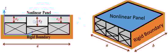 where a and b are the panel width and length; c1, c2, and c3 are the cavity depths; ρa is air density, 1.2 kg/m3; W(x,y,t) is the nonlinear transverse displacement; P is the acoustic pressure field within the cavity and the acoustic governing equation is given by [12,20]:
