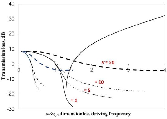 Figure 2 shows the comparison between the frequency response curves obtained from the proposed method and the modified residue harmonic balance method [18]. The results obtained from the two methods reasonably agree with each other. The main discrepancy occurs (1) at very low frequency ( ≈ 0.6), where the two solution curves intercept; and (2) at very high frequency ( > 5), the nonlinear solution curve from the proposed method is slightly lower. It is noted that the super harmonic solution of the proposed method is obtained by setting the response frequency equal to 3 × driving frequency. In the following case studies, the configurations and material properties of the nonlinear panel are: 200 mm × 200 mm × 1 mm aluminum panel, Young’s modulus E = 7 × 1010 N/m2, Poisson’s ratio ν = 0.3, and panel mass density ρ = 2700 kg/m3. Table 1 and Table 2 show the mode convergences and harmonic contributions for various driving frequencies. It can be seen that the nine-mode approximation can achieve three digital accuracies. When the driving frequency is higher, the higher harmonic components of the elliptic cosine solution form are more significant. In Table 2, it is found that when the driving frequency is near or above the first resonant frequency, the fundamental harmonic component is always dominant (over 90%); when the driving frequency is far below the first resonant frequency and the excitation level is higher (e.g., k = 150) and the higher harmonic components would be more significant. When a harmonic balance method is adopted for such case, there would be more nonlinear coupled equations generated in the harmonic balance procedures. It is due to more harmonic terms being required. As aforementioned, the main advantage of the proposed approach is that one elliptic cosine contains various harmonic components, while one simple cosine term carries one particular harmonic component. That is why the proposed solution form can be more concise than those in the harmonic balance procedures. Figure 3 and Figure 4 show the panel amplitude and transmission loss plotted against the excitation frequency for various excitation magnitudes, respectively. In Figure 3 and Figure 4, the peak frequency increases with the excitation magnitude. The bigger the excitation magnitude is, the longer the nonlinear solution curve extends. In the case of small excitation magnitude, the amplitude peak and transmission loss dip are much more symmetric. In Figure 3, the differences between the amplitude curves of the four different excitation magnitudes are obvious. On contrary, in Figure 4, the differences between the transmission loss curves of the four different excitation magnitudes are almost undetectable in the linear and low frequency nonlinear cases. The tips of the nonlinear solution curves are far from each other. Note that according to the linear theory, the resonant peak frequencies and transmission loss dips are independent of excitation magnitude. In Figure 3, the nonlinear solution curve of k = 50 appears as a straight line with a shallow slope (note the excitation magnitude in this case is very large). The super harmonic solution curve is the longest one. There is an interesting finding in Figure 4. The overall slopes of the nonlinear and super harmonic transmission curves of k = 50 are also quite shallow. Unlike those of other curves, the upper and lower limits of them are only about ±8 dB. It is implied that under very large excitation, the nonlinear panel sound transmission would not vary largely for different driving frequencies. Besides, it is found that in the case of the smallest excitation magnitude, there is a narrower transmission loss dip and a higher dip value; and in the case of the biggest excitation magnitude, the nonlinear vibration would widen the transmission loss dip and decrease the dip value. From this observation, for wideband excitation, the nonlinear vibration would make the overall transmission loss worse; and for narrowband excitation (near the resonant frequency), the linear vibration would make the overall transmission loss worse. The negative effect of the super harmonic response would be minimal when the excitation magnitude is small. Figure 5 and Figure 6 show the panel amplitude and transmission loss plotted against the excitation frequency for various cavity depths, respectively. It is found that a longer cavity depth would induce a lower transmission loss peak frequency, and a higher transmission loss dip value. In the linear amplitude solution cases, the three curves are drawing closer when the driving frequency is higher. Unlike those in Figure 5, the linear transmission loss curves in Figure 6 are nearly parallel to each other for their frequency range. In the case of the shortest cavity depth, the tip values of the super harmonic amplitude and transmission loss curves are significantly smaller. It is due to the damping effect, which depends on the corresponding dip frequency, that it is much stronger. Besides, the nonlinear amplitude curve and linear transmission loss solution curve are the lowest. It is implied that the amplitude is the smallest due to the highest stiffness for that low frequency range, and the sound reduction capacity of the panel is the weakest for the high frequency range. Note that the nonlinear transmission loss solution curve is the lowest only for the dimensionless driving frequency less than one and higher than two. The linear amplitude solution curve is the highest one. This is implied that the overall stiffness is the weakest in the linear solution case.