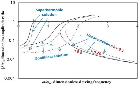 Amplitude ratio versus excitation frequency for various excitation magnitudes (c/a = 0.5, ξ = 0.02, single cavity).