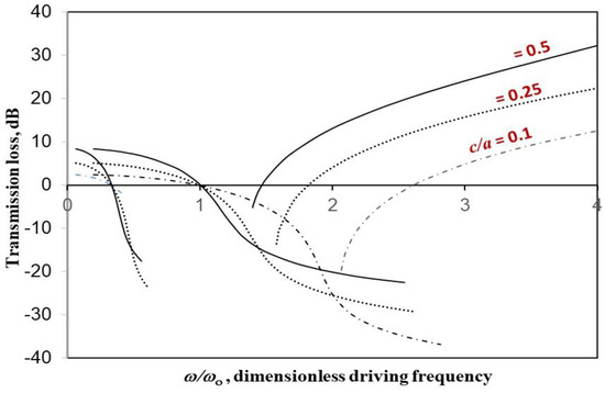 Transmission loss versus excitation frequency for various cavity cases (c/a = 0.5, k = 5, ξ = 0.02).