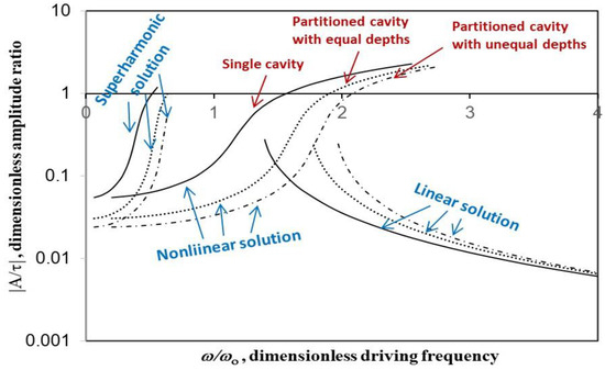 Amplitude ratio versus excitation frequency for various cavity cases (c/a = 0.5, k = 5, ξ = 0.02).