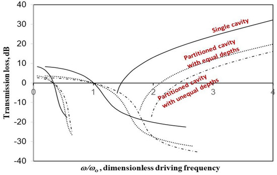 Figure 7 and Figure 8 show the panel amplitude and transmission loss plotted against the excitation frequency for various partitioned cavity cases, respectively. The average cavity depths in the three cases are the same. The patterns of the solution curves in Figure 7 and Figure 8 are very similar to those in Figure 5 and Figure 6. The solution curves of the partitioned cavity with unequal cavity depths and the partitioned cavity with equal cavity depths are analogous to those of the shortest and second shortest cavity depths in Figure 5 and Figure 6, respectively. The depths of the partitioned cavity with unequal cavity depths are 50 mm, 200 mm, and 50 mm respectively. There are two partitioned cavities with depth of 50 mm, where the stiffnesses are much stronger and thus, the overall stiffness is also the strongest. Besides, the overall stiffness of three smaller cavities is higher than that of one big cavity. That is why the solution curves of the partitioned cavity with equal cavity depths in between those of other two cases.