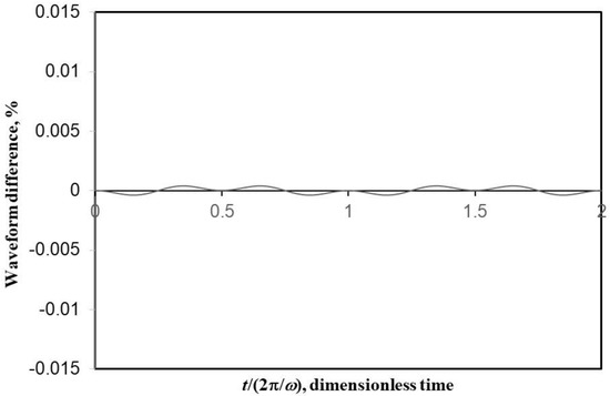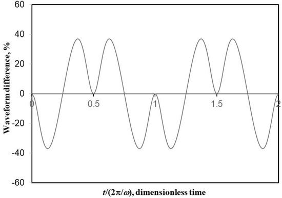 Difference between elliptic cosine and simple cosine (c/a = 0.5, k = 5, w/wo = 3, ξ = 0.02, single cavity, nonlinear solution).