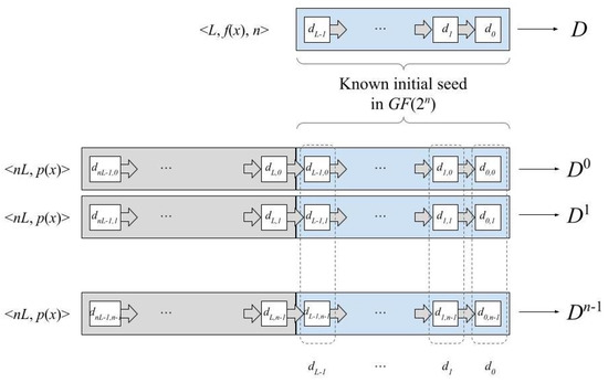 Once has been determined, we can construct the n LFSRs , but we need their respective seeds in order to generate the same sequence as that generated from the initial seed in the extended field. As it is derived from the equivalent model, the L known elements in that compose the initial seed only provide us with bits, while bits are needed to complete the n seeds in (see Figure 3). Thus, the seed of can be partially written in terms of the seed s of D as: