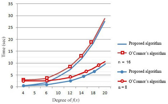 Regarding the algorithm for primitiveness testing, we can conclude that it has a better performance than O’Connor’s algorithm, one of the most used ones. The main advantage is that the proposed algorithm has to generate elements instead of the whole sequence or alternatively to perform as many divisions as elements in the maximal sequence over the extended field. The validation and comparison tests have been performed using Mathematica software, version , on a 64-bits Microsoft Windows platform running on a Intel(R) Core (TM) processor with i7-4510U CPU @ GHz and 16 GB RAM. The processor’s temperature and the amount of simultaneous running processes have been taken into account for the execution time comparison. Figure 4 shows the behavior of the algorithm with respect to O’Connor’s in and , respectively.