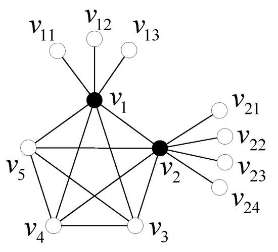 Next, we consider the bi-stars. Let be the bi-star with central vertices u and v, where and . Let and . Obviously, and , as shown in Figure 3.