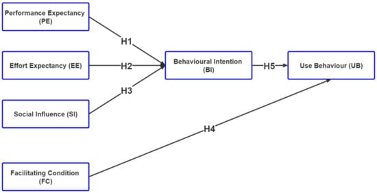 Behavioral Intention (BI) to technology use is defined as a person’s intention to adopt and use technology in the future []. This is the most significant factor influencing the UB of technology. In this study, the objective model adopts the original UTAUT model, with all PE, EE, and SI factors affecting BI and only FC affecting UB. Therefore, this study can examine the variables that intervene in BI to positively influence UB. According to Venkatesh [], there are fewer or no studies that show a relationship between user acceptance and individual usage outcomes. Based on this background, our fifth proposed hypothesis was:
