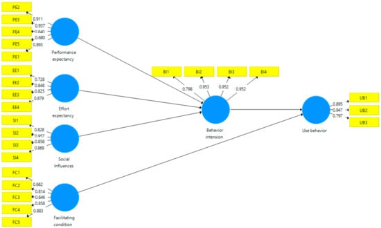 In this section, an evaluation of the structural model is performed, as shown in Figure 3. SEM was used to test the hypothetical relationship between variables [], and between UTAUT factors, Bi, and the UB of micro-lectures in Guangxi Province, China. Figure 3 describes the final structural model based on the results of the refinement criteria of the measurement model sections, which had 25 items.