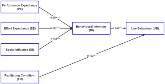 The degree to which a person believes that an environment supports the use of technology is defined as Facilitating Conditions (FC) []. In this study, it is the accessibility of an appropriate learning environment and infrastructure within a school that can promote the use of micro-lectures by secondary school teachers in teaching mathematics. According to previous studies, FC can have a direct effect on UB without going through BI [,,]. Due to its inconsistent influence on BI, FC is still being debated. Several studies have demonstrated that FC does not affect BI and UB [,,]. However, others found a positive effect of FC on BI [,,] and a significant effect of FC on UB [,,]. Due to the background that, in an educational context, there is a direct influence of FC on UB, our fourth proposed hypothesis was:
