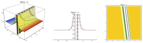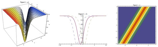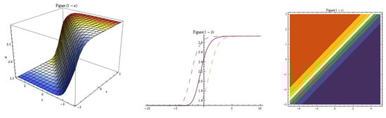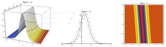 Three-dim, two-dim, and contour plots for Equation (12) represent the solitary wave with , , , , , , , , , , , , .