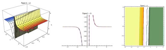 Three-dim, two-dim, and contour plots for Equation (19) represent the solitary wave with , , , , , , , , , , , .