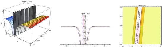 Three-dim, two-dim, and contour plots for Equation (33) representing solitary waves with , , , , , , , , , , , , .