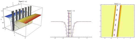 In this section we describe the similarities and differences between constructed solutions for the (3 + 1)-dimensional Jimo–Miwa equation in this study which have already been demonstrated in the previous literature. In this work, we have constructed novel and interesting results named solitary solutions. The series solution is the significant result in this study with the variety of five parameters, which have diverse constructions. The constant parameter values were collected with symbolic computation, then Equation (5) had different kinds of results named rational, trigonometric, and elliptic functions. The constructed results are novel, more general, and interesting solutions via this powerful and efficient method. Now, we compare our calculated results with other techniques (See Figure 1, Figure 2, Figure 3, Figure 4, Figure 5, Figure 6, Figure 7, Figure 8, Figure 9, Figure 10, Figure 11, Figure 12, Figure 13 and Figure 14).