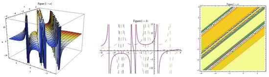 Three-dim, two-dim, and contour plots for Equation (25) representing the mixed solution with , , , , , , , , , , , , , .