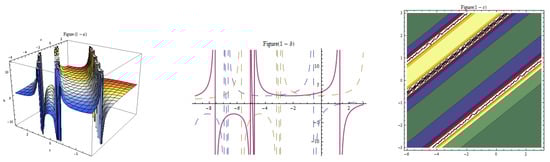 Three-dim, two-dim, and contour plots for Equation (29) representing mixed solutions with , , , , , , , , , , , , .