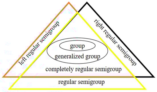 In Figure 1, the yellow triangle represents a regular semigroup, the red triangle represents a left regular semigroup and the black triangle represents a right regular semigroup. Their common part is the completely regular semigroup.