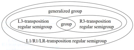 Above all, the L1/R1/LR-transposition regular semigroup is a completely regular semigroup, the L2/R2-transposition regular semigroup is a group and semigroup which are both L3-transposition regular semigroups, and the R3-transposition regular semigroup is a group. Figure 2 shows the relationships among various transposition regular semigroups.