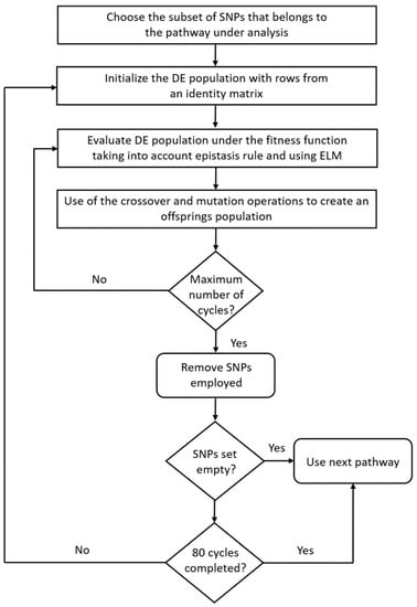 The algorithm is applied as shown in Figure 1. The first step involves choosing the subset of SNPs that belongs to the pathway under analysis. The DE population is then initialized with a set of individuals in which one SNP is active. This is why in the flowchart it says that the DE population is initialized by making use of the rows of an identity matrix. The following step consists of evaluating the DE population under the fitness function, taking into account the epitasis rule and using ELM as the classification algorithm whose performance is assessed by means of the area under the ROC curve. Taking into account the performance obtained, a new DE population is created, using the current population as a starting point. Should the maximum number of cycles be reached, the SNPs already employed in the element of the population which has performed the best are taken out. This process is then carried out again, and only halted when the SNPs set is empty or when 80 cycles in total have reached completion.
