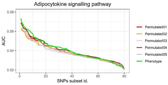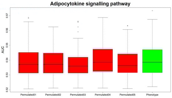 In this research, a figure for each pathway under analysis was created. Figure 2 shows the values that were obtained by applying the proposed algorithm to the adipocytokine-signaling pathway in six different cases, one of which is the one in which cases and controls were labeled correctly as cases and controls while the other five show the results achieved by five different permutations. In the six algorithm executions presented, the AUC values are ordered from higher to lower to make it easier to interpret the curves obtained. In the case of the pathway mentioned, the curve that represents data without cases and controls permutations is not higher than those curves obtained by making use of permutated cases and controls labels, as they are very close to each other. This result is confirmed by the boxplot presented in Figure 3, where the median AUC value obtained for cases and controls correctly labeled is very similar to the median values achieved for the five algorithm executions with permutated labels represented in the same figure.