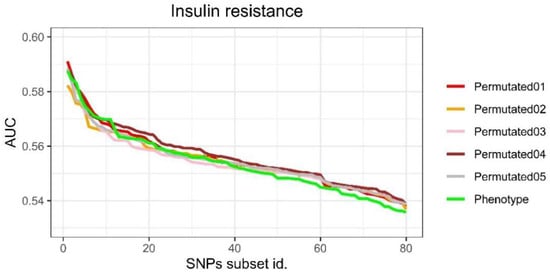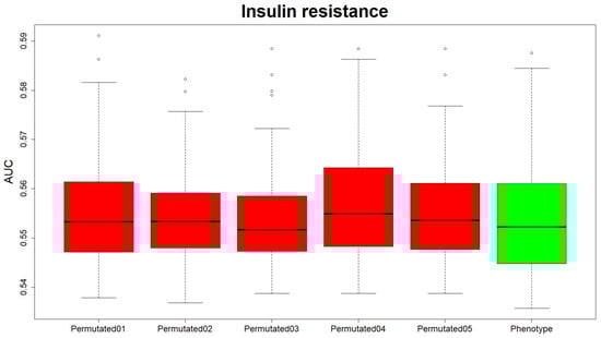 Insulin resistance: AUC values of 80 iterations for the execution of the algorithm with cases and controls correctly labeled and five different permutations.