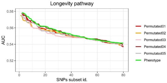 Longevity pathway: AUC values of 80 iterations for the execution of the algorithm with cases and controls correctly labeled and five different permutations.