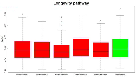 Boxplot of the longevity pathway AUC values of the 80 iterations of 5 executions of the algorithm with the labels of cases and controls permutated and one with cases and controls correctly labeled. Red color represents permutated cases, green color represents the phenotype case and circles are outliers.
