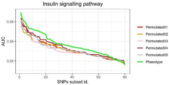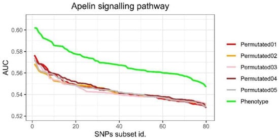 The numerical results produced are presented in Table 1. This table contains the following information on all the pathways under analysis: how many SNPs make up the pathway subset, how many different SNPs of the pathway employed in any of the models showed the best AUC performance, what AUC value the algorithm obtained on average, the AUC value when phenotypes were permutated, and what percentage of non-permutated AUC values were greater than the highest permutated AUC value that was obtained.