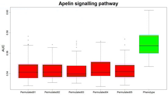 Boxplot of the apelin-signaling pathway AUC values of the 80 iterations of 5 executions of the algorithm with the labels of cases and controls permutated and one with cases and controls correctly labeled. Red color represents permutated cases, green color represents the phenotype case and circles are outliers.