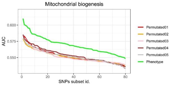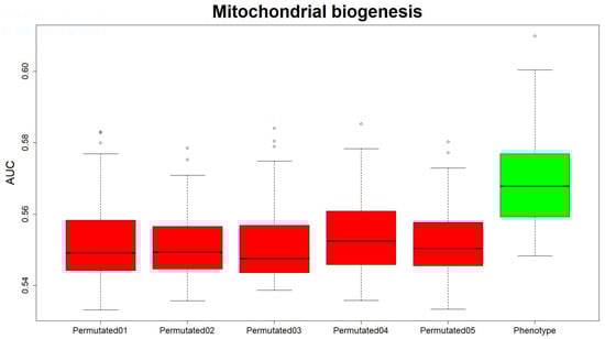Mitochondrial biogenesis pathway: AUC values of 80 iterations for the execution of the algorithm with cases and controls correctly labeled and five different permutations.