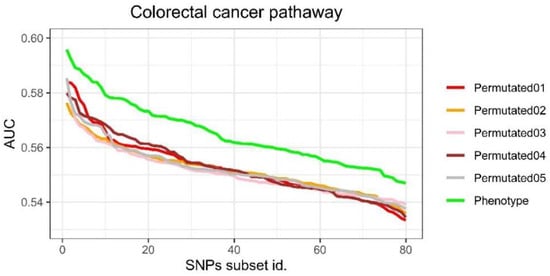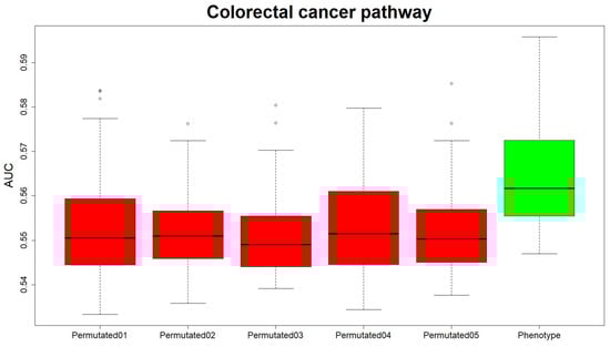 The three following pathways under study were the apelin-signaling pathway that is represented in Figure 8 and Figure 9, the mitochondrial biogenesis pathway that is presented in Figure 10 and Figure 11 and the colorectal cancer pathway that can be observed in Figure 12 and Figure 13. In these three pathways, the curve that represents the AUC values obtained by the algorithm when applied to the subset in which labels correspond to cases and control has undoubtedly higher values than those obtained when permutation was applied. The same effect is observed in their corresponding boxplots, as the median value for the algorithm execution without permutation of cases and controls is higher than the five executions in which cases and controls are permutated. Even in the case of the apelin-signaling pathway and the mitochondrial biogenesis pathway, the value that corresponds to the 25th percentile of the executions without permutation is higher than the 75th percentile of most of the permutated executions. These graphic results are in line with those presented in Table 1, where the AUC value for the apelin-signaling pathway was 0.578882, as compared to 0.542724 when it was permutated. Something similar occurred in the case of the mitochondrial biogenesis pathway, where the AUC value achieved was 0.578295, while with permutated labels, the average value was 0.550624. In the case of the colorectal cancer pathway, the AUC value was 0.583862, while in that of the permutated pathways, the average value was 0.569623. It is also of interest to highlight that in these three pathways, fully 100% of the permutated subsets obtained results under the subset with cases and controls correctly labeled.