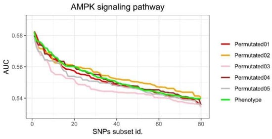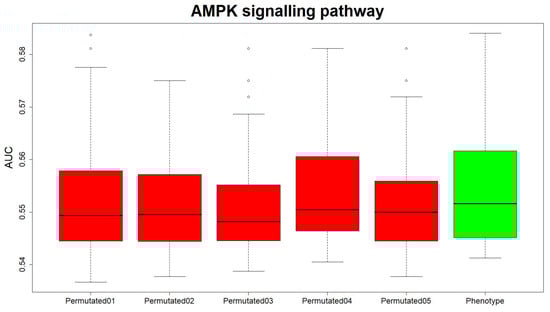 Figure 14 represents how the algorithm behaves when applied to the AMPK-signaling pathway. For this pathway, the phenotype curve is close to the permutated ones. The same result is observed in the boxplot of Figure 15. The numerical results, presented in Table 1, where the AUC value of the phenotype curve is higher than the value obtained when the cases and controls were permutated, show a slightly better result in the case of no permutation. In this figure, the cases and control curves perform better than 89.45% of the permutated curves. In other words, there are some randomly labeled subsets where the algorithm achieves better AUC results than in the case of cases and controls.