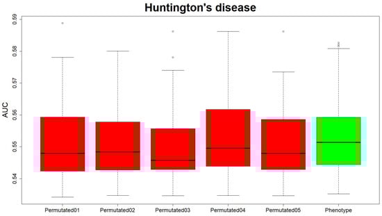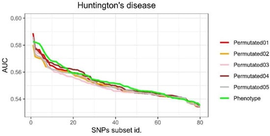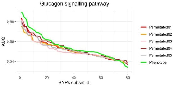 Figure 16 and Figure 17 show the results obtained for the glucagon-signaling pathway, while Figure 18 and Figure 19 do the same for the Huntington’s disease pathway. In both cases, the phenotype curve is very close to the permutated curves, although its average value appears to be a little higher. Taking into account those values presented in Table 1, in both pathways, the AUC value of the cases and control is slightly higher than the permutated ones. In the case of the glucagon-signaling pathway, 81.95% of the permutated subsets obtained an AUC value lower than the ones not permutated, while in the case of the Huntington’s disease pathway, these percentages rose to 85.15%.
