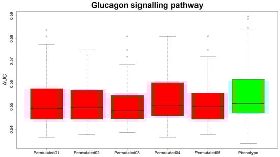 Boxplot of the glucagon-signaling pathway AUC values of the 80 iterations of 5 executions of the algorithm with the labels of cases and controls permutated and one with cases and controls correctly labeled. Red color represents permutated cases, green color represents the phenotype case and circles are outliers.
