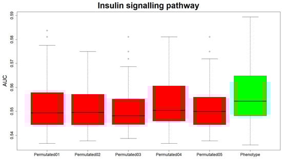In Figure 4 the results obtained for the insulin-resistance pathway can be seen. Figure 5 shows the boxplot of the insulin resistance AUC values of the 80 iterations of 5 executions of the algorithm with the labels of cases and controls permutated and one with cases and controls correctly labeled, while Figure 6 shows the same information that Figure 4 for the longevity pathway. In both cases, and this also occurs in Figure 2, for the green curve, called a phenotype and which refers to the results produced by the algorithm when applied to the data with the labels correctly assigned to cases and controls, the AUC values show a great similarity to those obtained with permutated labels. Please also note that the same effect can be noticed in Figure 5 and Figure 7 as in both cases the median value of the AUCs for cases and controls is not higher than the median value of all the permutated executions. Therefore, it must be inferred that these three pathways are not linked to colorectal cancer.