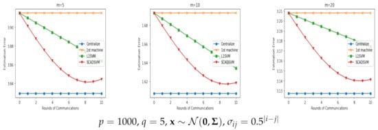 Not only can the size of data be exceedingly large, but also many successful models are heavily over-parameterized. These problems have been discussed widely. Zou [10] proposed an improved penalized SVM for simultaneous feature selection and classification, and showed that the hybrid SVM not only often improved the classification accuracy, but also enjoyed better feature-selection performance. Meinshausen and Buhlmann [11] studied the problem of variable selection in high-dimensional graphs, and explained that neighborhood selection with the lasso is a computationally attractive alternative to standard covariance selection for sparse high-dimensional graphs. Zhao and Yu [12] studied almost necessary and sufficient conditions for lasso to select the true model when or , where p was the dimension of the model parameters and n was the sample size. Meinshausen and Yu [13] introduced sparse representations for high-dimensional data and proved that the estimator was still consistent even though the lasso could not recover the correct sparsity pattern. The adaptive lasso was proposed by Zou [14] and is a new version of the lasso that enjoys oracle properties. In the high-dimensional problems, the dimension p of the covariates was larger than the size of data, but there were only a few covariates that were relevant to the response. As a concrete example, in a microarray data set, which contains more than 10,000 genes, only several genes will make a difference to the result. Recently, the statistical inference for high-dimensional data has been investigated; readers can refer to [15,16] for details. In high-dimensional surroundings, a standard SVM can be easily affected by many redundant variables, so variable selection is important for high-dimensional SVMs. Fan and Fan [17] has shown that it was as poor as “tossing a coin” if all features were used in classification due to the accumulation of noise in high-dimensional analysis. Many works have been proposed to handle such a problem. Bradley and Mangasarian [18], Peng et al. [19], Zhu et al. [20] and Wegkamp and Yuan [21] studied the penalized SVM; Fan and Li [22] proposed an approach of variable selection and the estimation of model simultaneously by using a smoothly clipped absolute deviation penalty (SCAD) or minimax concave penalty (MCP), which are non-convex. Becker et al. [23], Park et al. [24] and Zhang et al. [25] considered the SCAD penalized SVM. Lian and Fan [26] gave the divide-and-conquer debiased estimator for an SVM, but such simple averaging might result in high computational costs for the high-dimensional problem, although it could become a debiased estimator by the lasso penalty. Jordan et al. [3] proposed the communication-efficient surrogate likelihood (CSL) framework for solving distributed statistical inference problems, which could work for high-dimensional penalized regression. As [27] stated, the CSL approach is different from distributed first-order optimization methods, which leverage both global first-order information and local higher-order information; yet, to the best of our knowledge, the distributed inference of variable selection for high-dimensional SVM has not been studied in the CSL framework.