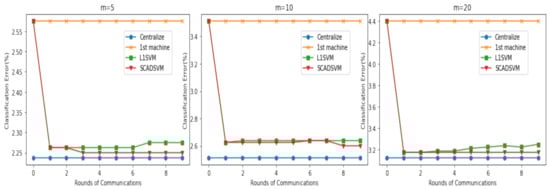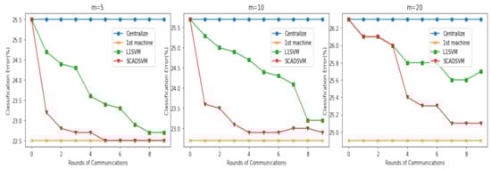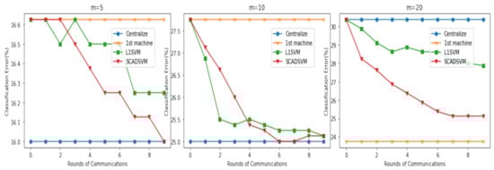 Approximately 80% of the data was used to train the model and the remaining was applied to test the model. In distributed learning, we used the number of worker machines m = 5, 10, and 20, respectively. The results of classification errors for the three datasets are provided in Figure 4, Figure 5 and Figure 6. From Figure 4, Figure 5 and Figure 6, we found the following: