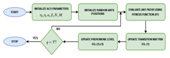 Then the best solution is determined and the current solution are assigned to the candidate solutions of the ACO. In addition, the ACO starts with assigning each candidate solution as an initial path for an ant in the colony. An ith ant initially traverses a subset of features initialized with a pheromone value greater than 0.5 and updates candidate solutions according to Equations (1)–(3). The FF evaluates the enhancement in the candidate solution, and it is updated only if its fitness value is decreased after the update. A candidate solution is updated according to the following equation: