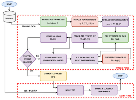 According to [40], there are several ways to hybrid Mas. High-level relay hybrid (HRH) strategy is one of these methods. In this strategy, two MAs can be executed in homogenous (i.e., same algorithms) or heterogeneous (i.e., different algorithms) sequences. The proposed ACO-RSA method uses the heterogeneous HRH strategy to achieve exploitation-exploration balance as in RSA with high exploitation as in ACO. Figure 3 illustrates the overall process of the ACO-RSA approach. At first, ACO, RSA, and shared parameters are initialized. A random number uniformly distributed in the range (−1, 1) initializes N candidate solutions each for M-dimensional feature vectors. Then FF evaluates candidate solutions to judge the enhancement by comparing current solutions with the obtained solutions in the previous iteration. If the current solution is better than the previous solution, it will be accepted; otherwise, it will be rejected.