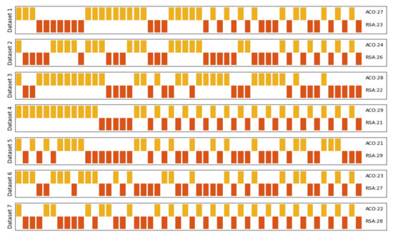Figure 4 presents the switching behavior of the proposed ACO-RSA during 50 exploitation-exploration iterations for all the seven datasets. The total number of iterations for the ACO and RSA are displayed in each switching behaviors in the last column in Figure 4. In datasets 3 and 4, ACO uses slightly more iterations than RSA to exploit many features. The iterative design of ACO requires more than one iteration to build confidence in the estimated shortest path. Hence, Table 6 shows a significantly higher CT for these datasets. On the other hand, datasets 1, 2, 5, and 6 have comparatively fewer features, and therefore, more iterations are used by the RSA, resulting in a very close CT to the one obtained using the proposed ACO-RSA. For dataset 7, a very higher number of training examples causes a larger delay for each iteration of ACO. This results in a significant impact on the CT of the proposed ACO-RSA than the fastest RSA algorithm.