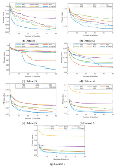 Figure 5 demonstrates convergence behavior of the ACO-RSA and the other comparative MAs for all datasets over the defined number of iterations on the x-axis and the fitness values on the y-axis. It presents the average convergence behavior obtained by executing each algorithm 20 times. In these convergence curves, the method with the rapid convergence is the best one.