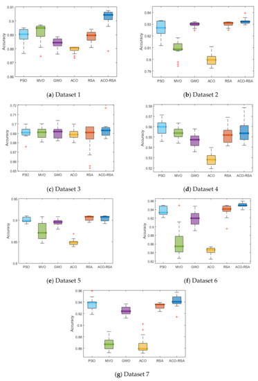 In the boxplots, a small degree of dispersion (the gap between the best, the median, and the worse) refers to the algorithm’s robustness that achieves the same results in the experiment. It can be seen from Figure 6 that the ACO-RSA is more robust than the other comparative MAs on most the datasets. This indicates the efficacy and robustness of the ACO-RSA approach compared to the PSO, MVO, GWO, standard ACO, and standard RSA methods.
